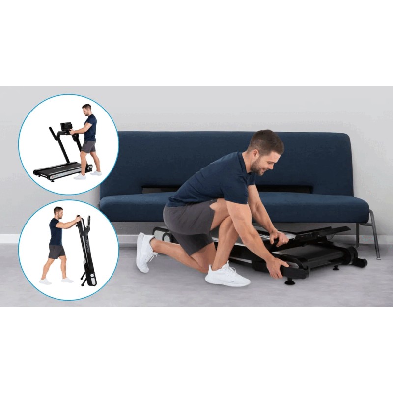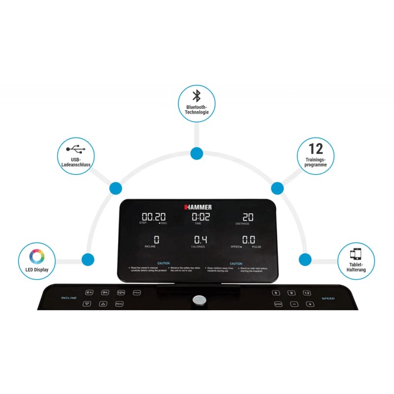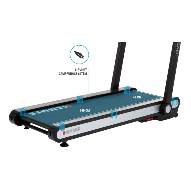 Das HAMMER Laufband Q. VADIS 3.0 überzeugt dich mit durchdachten und laufstarken Features! Superschnell klappbar mit cleverem und genialem Design. Ausgeklappt und voll einsatzfähig stehen dir Geschwindigkeiten von bis zu 18 km/h bevor und die volle Leistung des 2 PS Laufbandmotors. Ein Trinkflaschenhalter ist ebenfalls am Laufband integriert. Zusätzlich kannst du dich mit der innovativen Fitness-App Kinomap virtuell motivieren. Das HAMMER Q. VADIS 3.0 Laufband überzeugt zusätzlich mit seinem edlen Design, dem großem gut ablesbaren LED-Display und ist bereits zu 100% vormontiert! Nach dem Training findest du schnell einen passenden Abstellplatz in deiner Wohnung. Mit dem innovativen extra „Fold Button“ an der Konsole und dem Fußpedal kannst du dein Laufband, ohne zu schrauben in vertikaler oder horizontaler Position abstellen. Egal ob unter dem Bett, oder in der Ecke neben dem Schrank. Dein Q. VADIS 3.0 kann platzsparend verstaut werden.